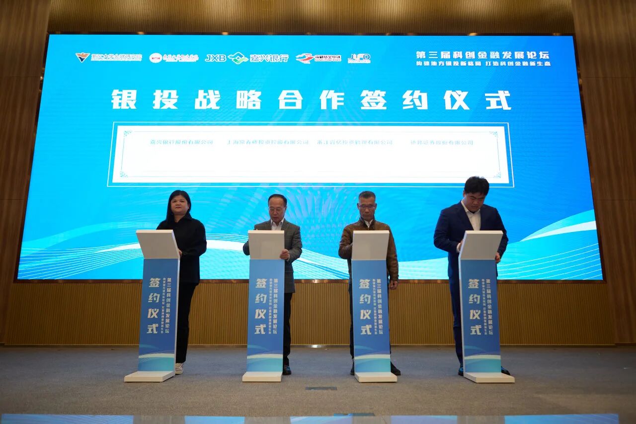论坛举行了“协同创新:银投战略合作签约仪式”。嘉兴银行与上海常春藤投资控股有限公司、江容亿投资管理有限公司、德邦证券股份有限公司签署战略合作协议,各方将围绕“科技金融+股权投资”双轮驱动,探索“投贷联动、风险共担、利益共享”的新型合作机制,共同探索投早、投小、投硬科技的银投合作嘉兴路径。