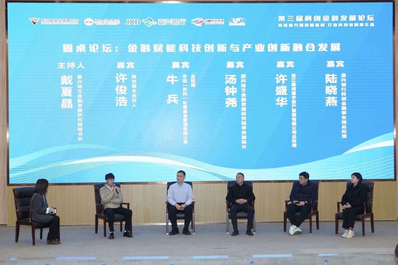 在圆桌对话环节,晓池资本合伙人许俊浩、宇迹(苏州)私募基金管理有限公司总经理牛兵、嘉兴地方金融发展研究院常务副院长汤钟尧、浙嘉创盛资产管理总经理许盛华、嘉兴银行科创金融事业部总经理陆晓燕,围绕“金融赋能科技创新与产业创新融合发展”主题分享了实践案例与工作实绩,并就赋能路径中的亮点、挑战及应对策略提出了新颖独到观点,引起与会成员的强烈共鸣和高度认同。该环节由嘉兴地方金融发展研究院秘书长戴夏晶主持。