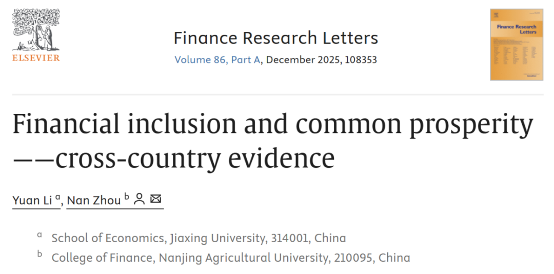 近日,我院李渊博士与南京农业大学金融学院周南副教授合作论文 “Financial Inclusion and Common Prosperity——Cross-country Evidence”在浙江大学经济学院国际B类期刊Finance Research Letters发表。李渊博士为论文第一作者,嘉兴大学经济学院为第一作者单位。
