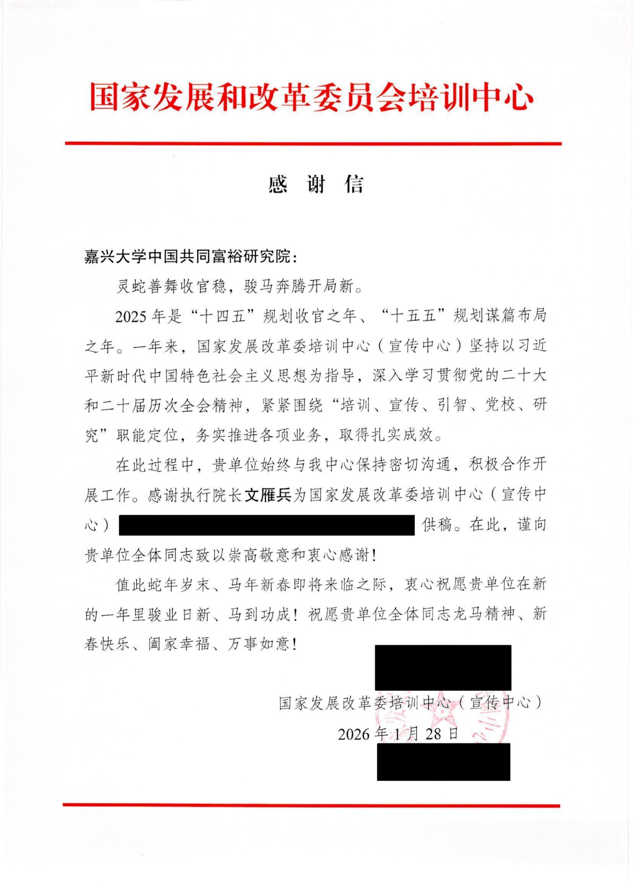 近日,嘉兴大学中国共同富裕研究院和文雁兵教授收到国家发展和改⾰委员会培训中⼼(宣传中心)感谢信。近年来,培训中⼼(宣传中心)紧紧围绕 “培训、宣传、引智、党校、研究” 职能定位,务实推进各项业务,取得扎实成效。在此过程中,嘉兴大学中国共同富裕研究院与培训中⼼(宣传中心)保持密切沟通,积极合作开展⼯作,⽂雁兵教授为培训中⼼(宣传中⼼)提供专家讲座、咨询服务和研究成果。