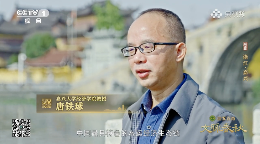 节目中,我院唐铁球教授受邀出镜,围绕嘉兴王江泾镇及其所处的运河水系,从地理区位、城镇格局和经济模式等层面系统阐述了运河水系与嘉兴经济发展的关系。唐铁球教授介绍,大运河从江苏流入浙江后经过的第一个古镇,便是长虹桥所在的王江泾镇。该区域地势低洼,是重要的排水核心通道,因此运河河道在此相对宽阔。依托发达的水运条件,王江泾镇自古丝绸业兴盛,河道两岸频繁的往来交流,既支撑了区域经济发展,也承载着深厚的历史记忆与文化内涵;靠着运河水系,嘉兴建立了“府城-县城-市镇-村落”四级城镇格局,更催生出中国最具特色的水运经济生态链:嘉兴府通过月河码头掌控着运河干流的大宗贸易,各县城分管支流的物资调配,市镇沿着运河发展成为专业生产基地,村落提供生产资料。运河及其支流河道,串连起各个节点,带动着“水运-生产-集散”产业链运转起来。
