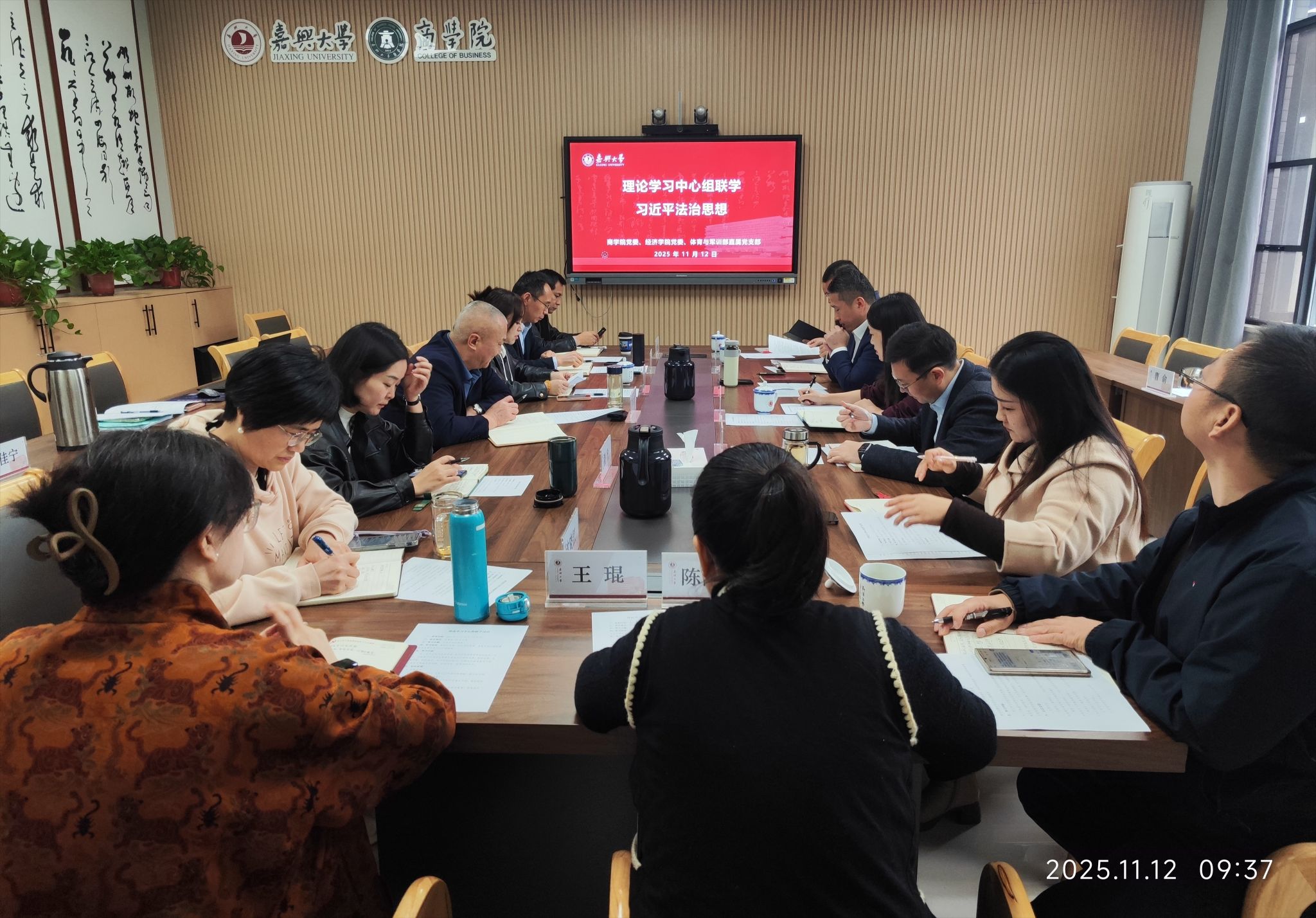 11月12日上午,商学院党委、经济学院党委与体育与军训部直属党支部联合开展理论学习中心组联学活动,以习近平法治思想为核心主题深化专题研学。校党委宣传部部长王火红莅临现场指导,商学院党委书记虞岚主持本次会议。