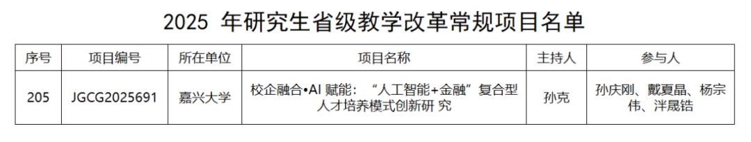 近日,浙江省教育厅办公室发布《浙江省教育厅办公室关于公布2025年本科和研究生教育省级教学改革项目的通知》,我院孙克教授主持申报的“校企融合•AI赋能:“人工智能+金融”复合型人才培养模式创新研究”项目成功获批,彰显了学院在复合型人才培养领域的创新实践与探索。