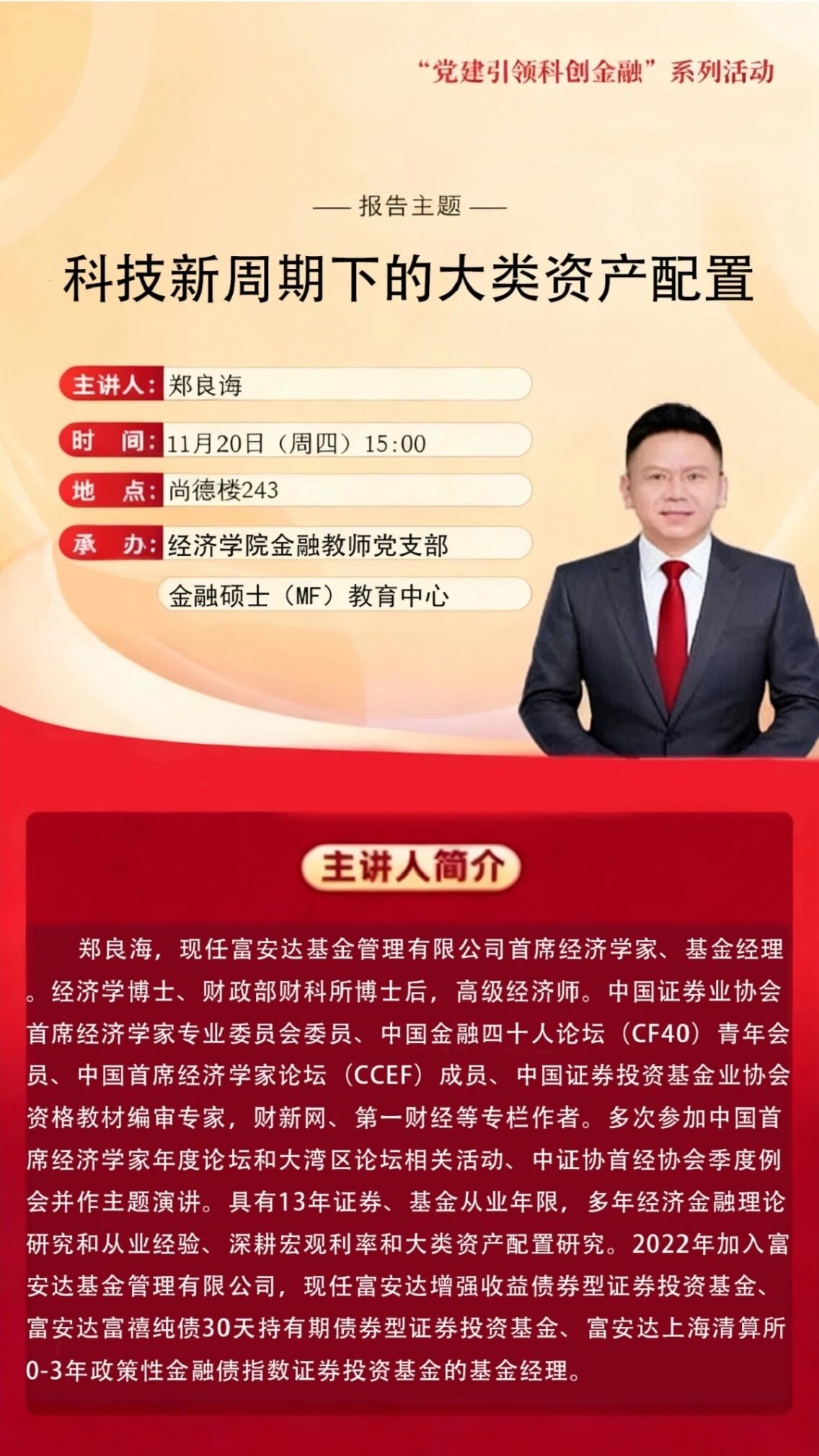 当前正值党的二十届四中全会闭幕、十五五规划谋定的关键阶段,我国在迎来科技新周期加速演进的同时,也面临全球科技竞争加剧与产业链深度重构的挑战。在此背景下,大类资产配置逻辑亟需调整,权益市场应聚焦硬科技、数字经济等战略性赛道以实现“结构化平衡”,黄金等避险资产则需把握波动中的配置节奏。经济学院金融教师党支部深入践行“党业互融互促”理念,推动金融研究、人才培养与地方科创需求精准对接,助力科技—产业—金融良性循环和高质量发展。